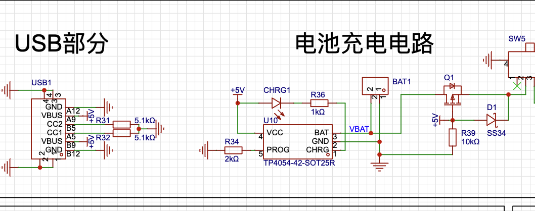 这里使用是SOT23-6小封装的充电芯片 4054,设置的充电电流为500mA,然后就是Q1这里的供电切换电路,至于原理这期的训练营硬件部分视频教程中有讲解,原理也比较简单,PMOS G极为低电平时导通,高电平截止,所以当没有插USB时,Q1低电平而导通,由电池供电,当插入USB后,G极为高电而截止,此时USB 供电的5V由 D1 进行供电。