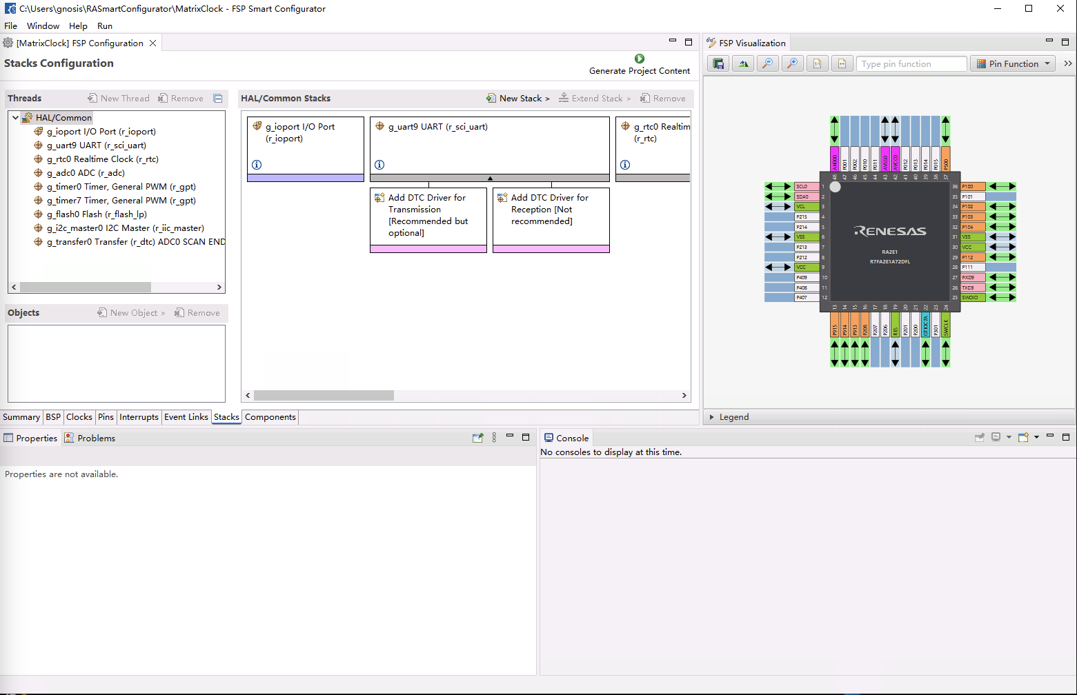 开发是使用的Keil5开发的,所以配置是使用的 FSP Smart Configurator 进行配置的,主要是配置了uart、RTC、ADC、TIM0、TIM7、Flash,可以使用 FSP打开工程目录下的 “configuration.xml”文件,就可以看到配置信息。