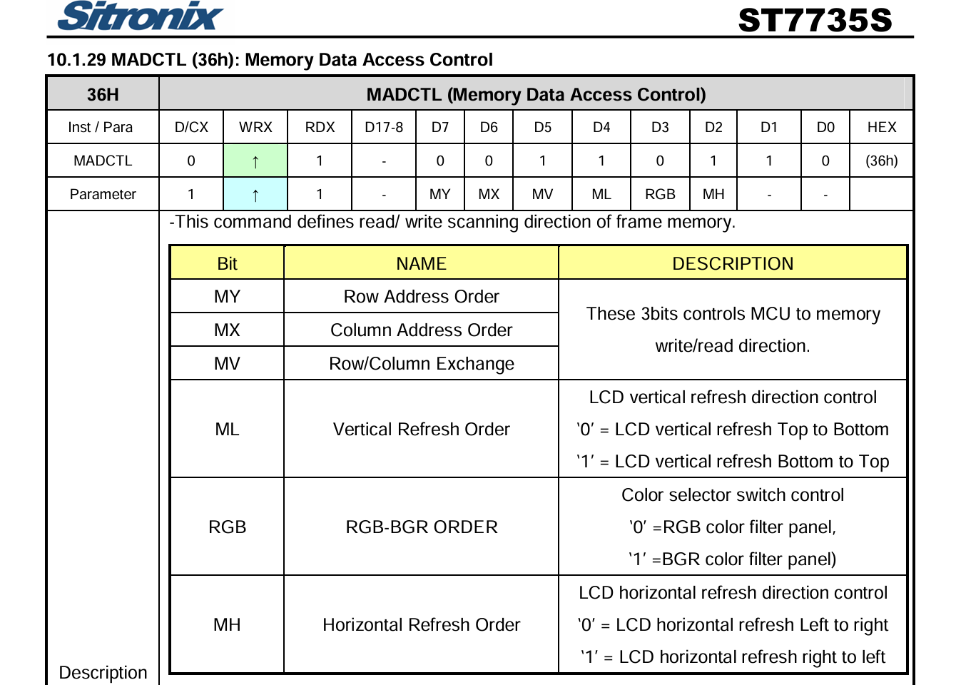 - ST7735S屏幕驱动十分简单,基本就是把商家提供的驱动代码改改,可能需要关注一下的命令就是0x36,可以看到这个命令控制了屏幕的显示方向,刷新顺序以及色彩RGB还是BGR