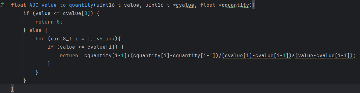 - 由4个数组,两个记录ADC转换的值,两个记录对应的电流电压,每个数组有5个元素,首尾是0和65535/电流电压最大值,获取到ADC转换值后进行换算,value小于第一个元素的都为0