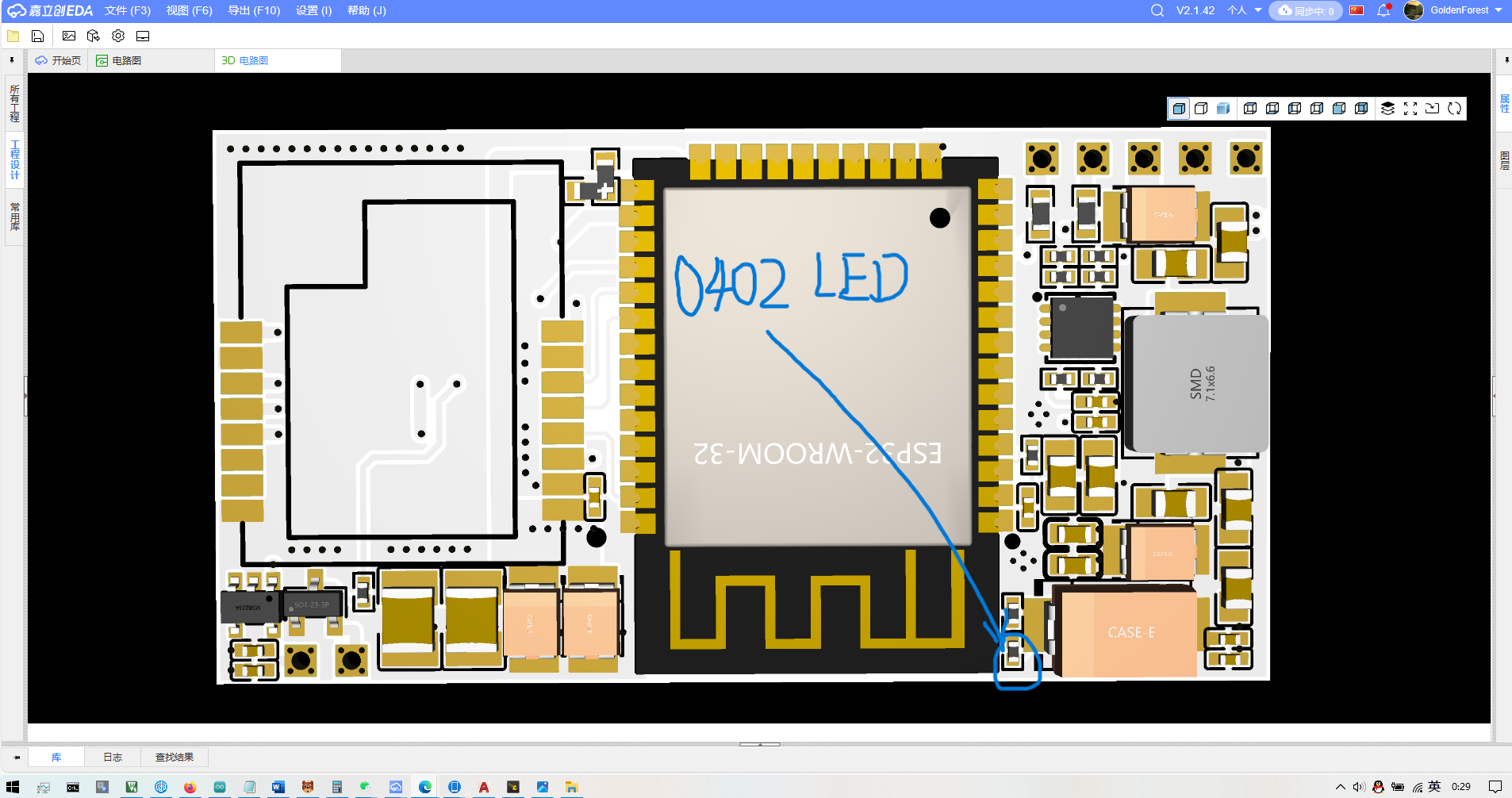 此处有一个0402 LED使用电阻封装减小面积