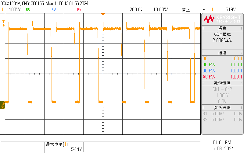 输入264VAC,输出20V满载,开关机测得氮化镓开关管VDS最高电压尖峰544V: