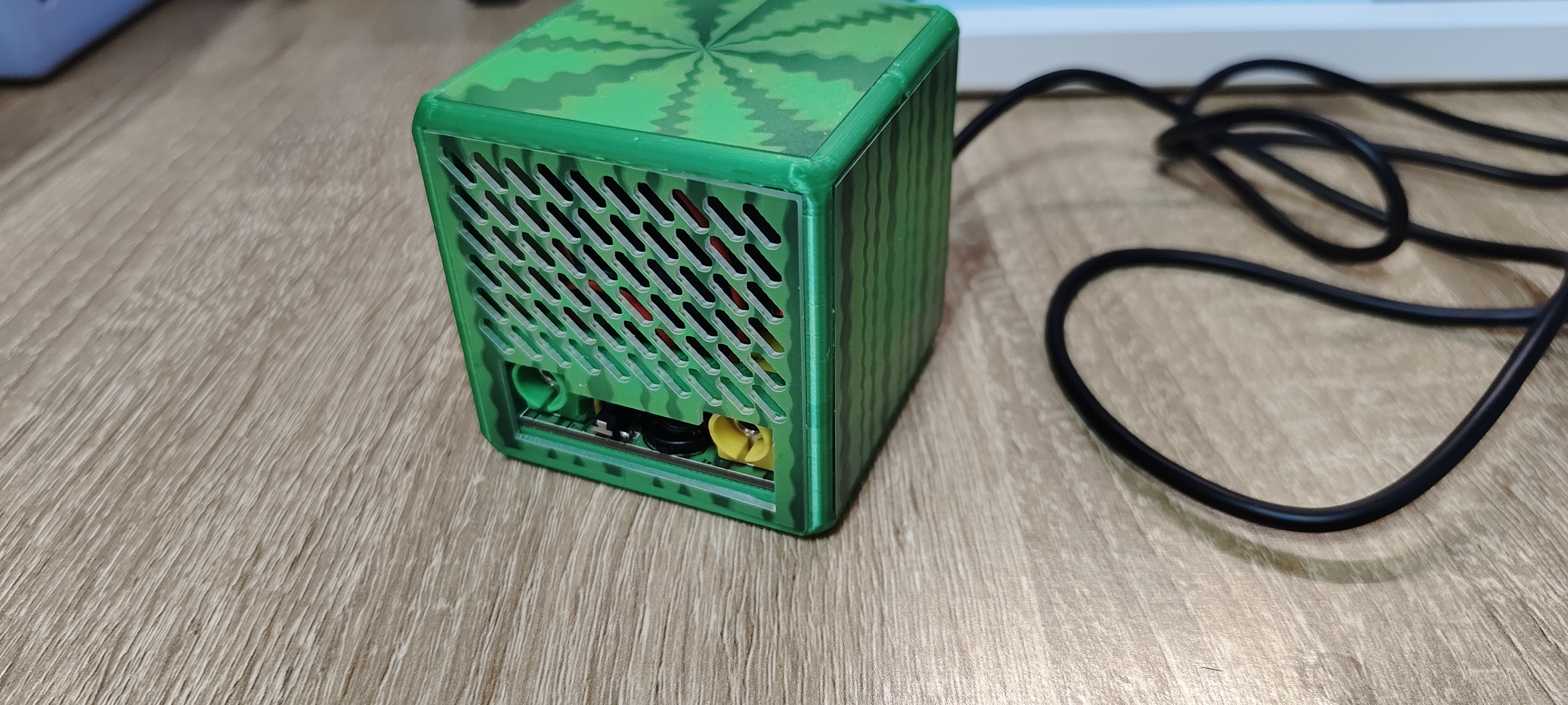使用ESP32C3与蓝牙音频模块制作的小音响, 添加了测量温湿度,热电偶测温功能 外壳设计基于西瓜造型,在炎炎夏日可以添