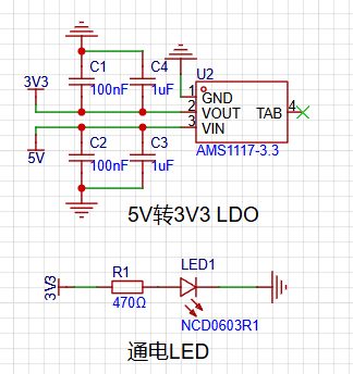 5V经过1117 LDO降压为3.3V用于MCU与部分模块供电