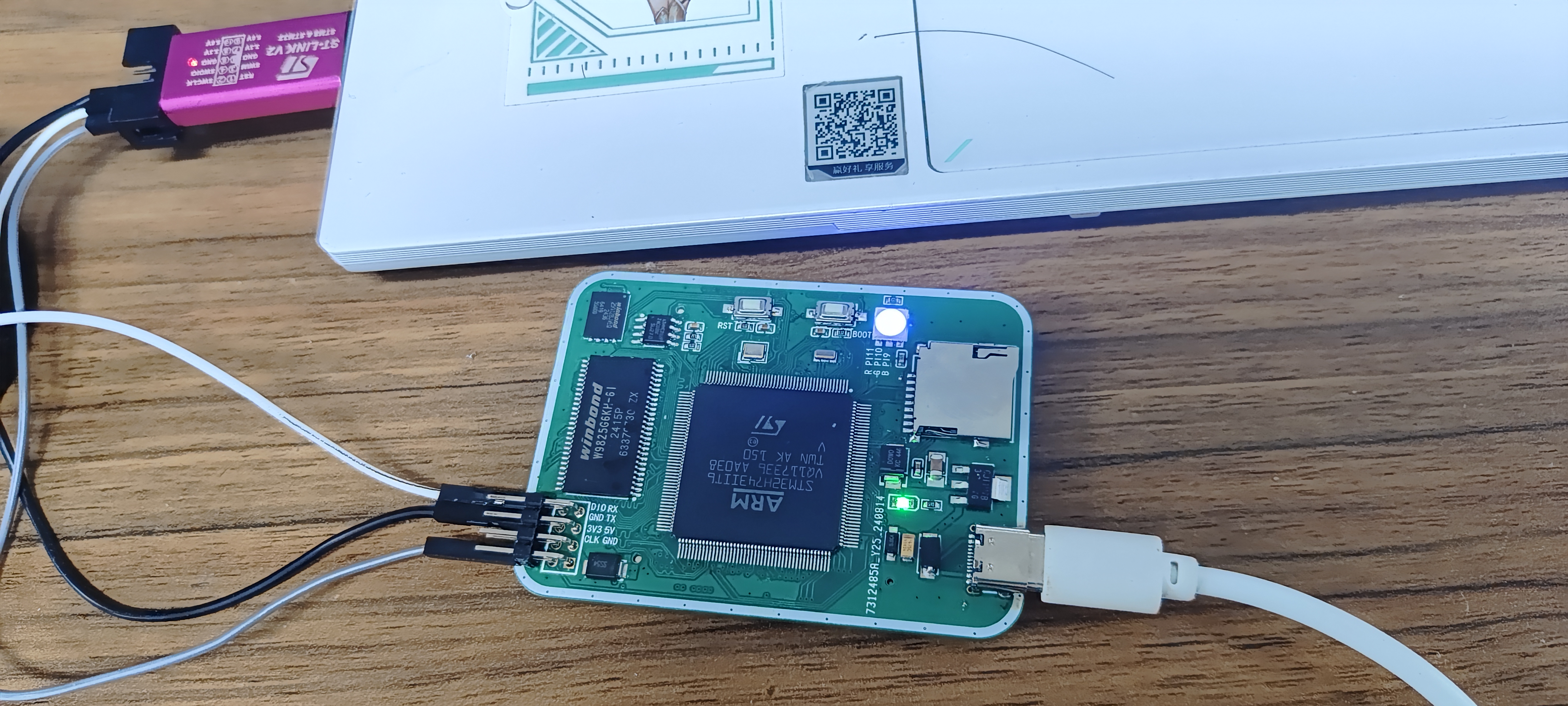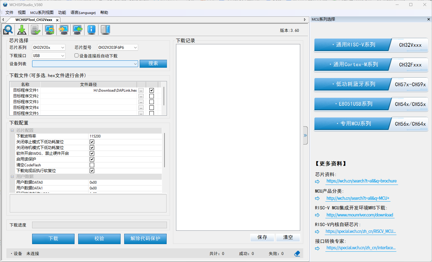 1.底板DAPLINK的程序烧录:打开烧录软件选择芯片型号,先短接外露的测试点到3.3V,然后插入USB,软件可以识别到芯片,进行烧录即可