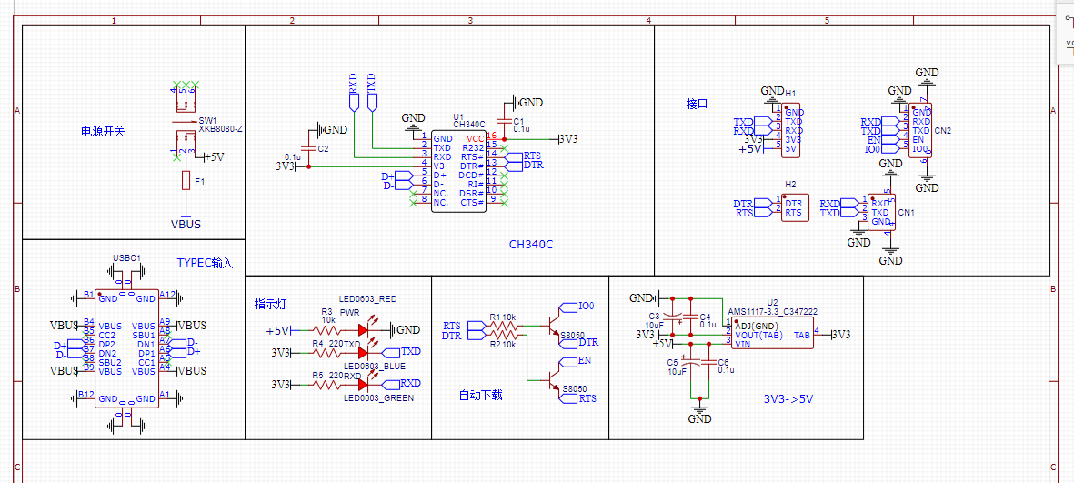 基于CH340C的USB转串口,自动下载程序,增加3pin 5pin插口试图统一UART烧录线,免去插杜邦线的各种不便,简化调试流程,让电路板无需自带USB转串口进行调试
