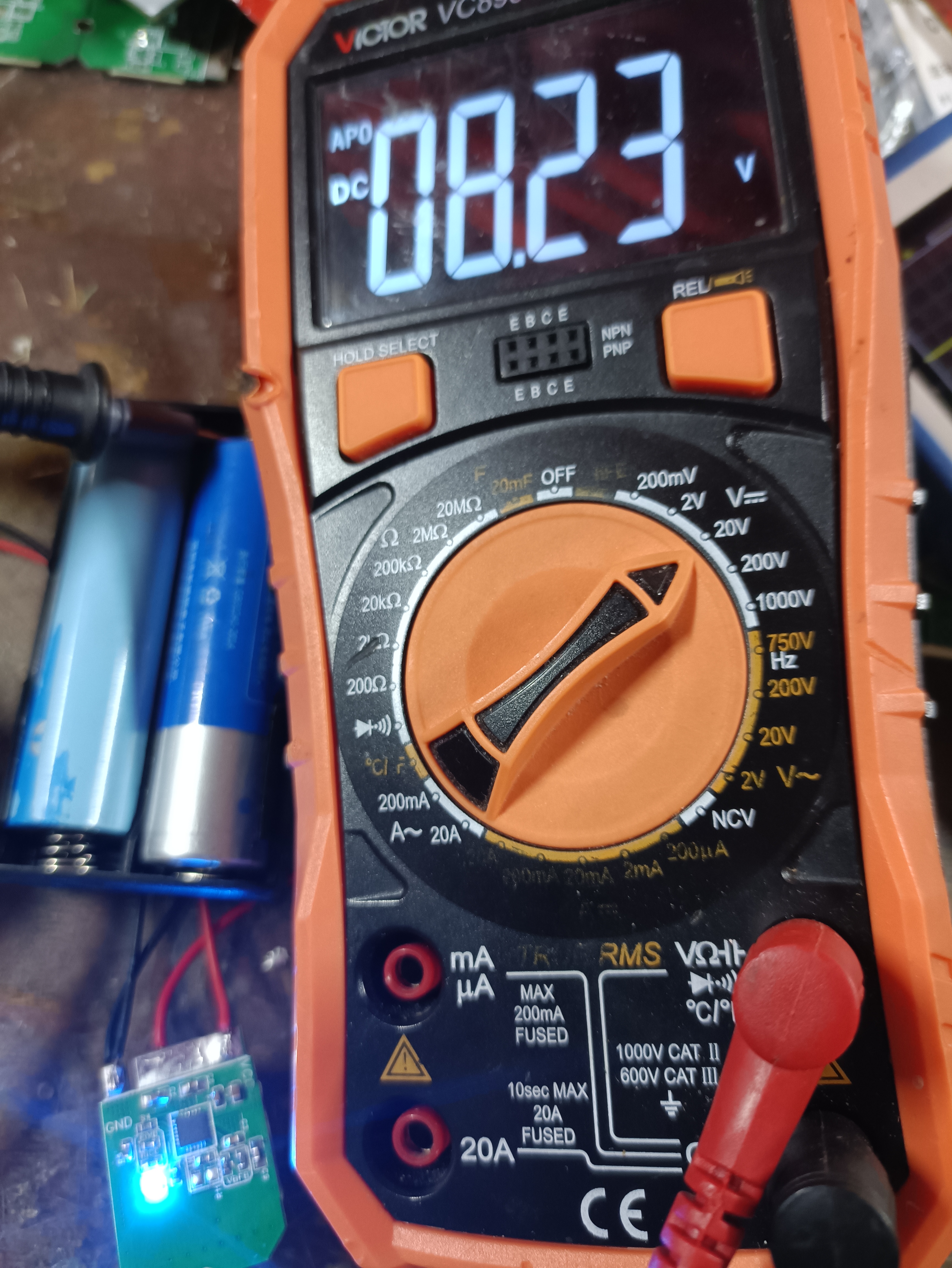 给电池充电测试,二串设置,设置电压8.3v(电阻没有,用的近似值)