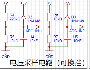 本项目设计分压电阻为220K+10K,因此分压比例为22:1(ADC_IN11)