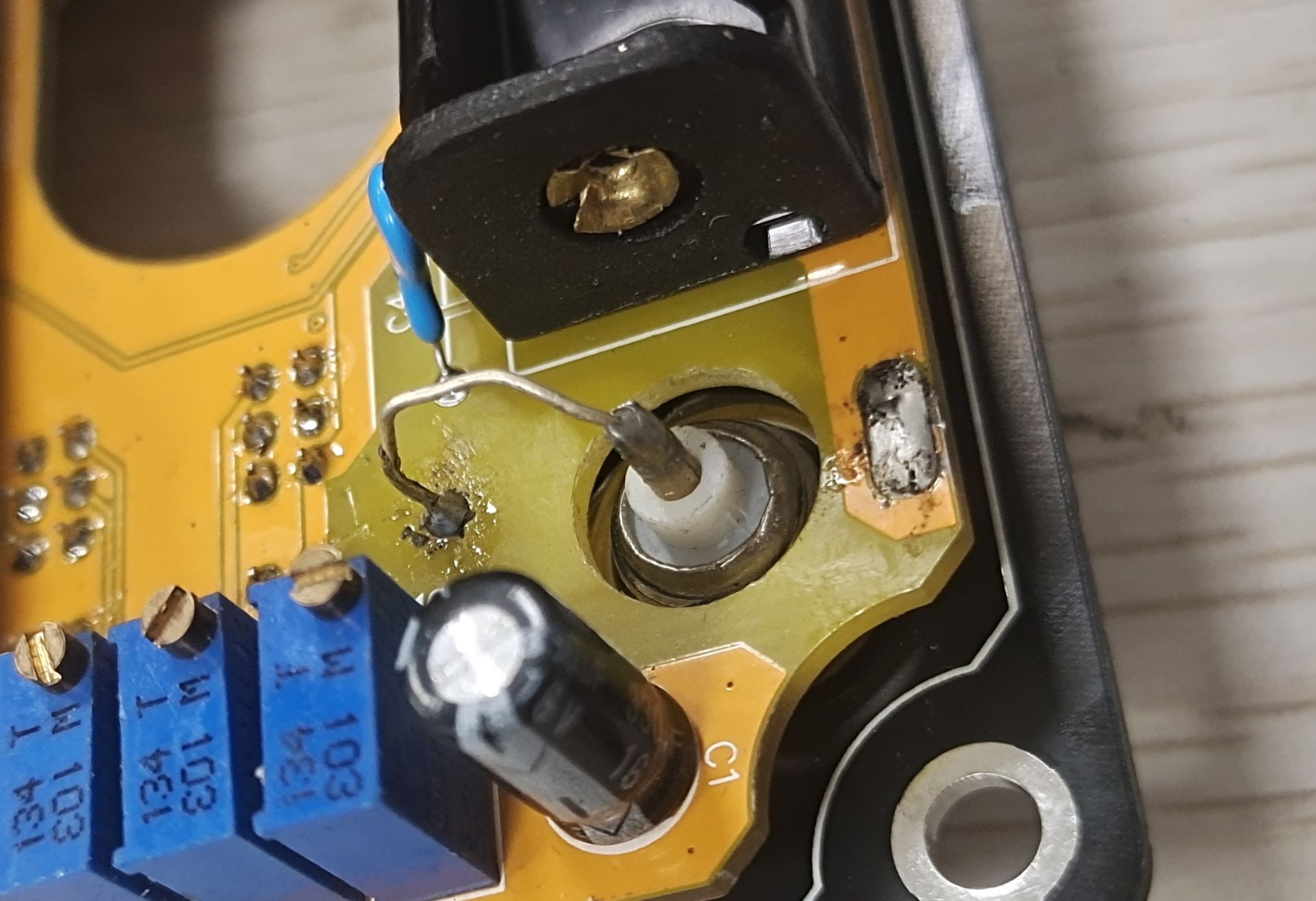对三个档位进行校准的电位器如下,注意调节时要缓慢,留出让指针稳定的时间,否则容易导致指针偏转幅度过大。