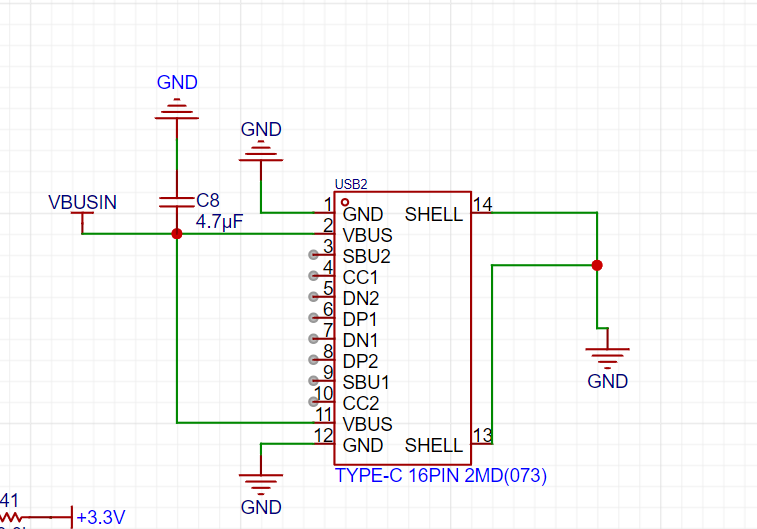 这里的供电方式采用更为现代的Type-C供电,这里仅连接了GND与VBUS引脚,仅用作供电,有兴趣的可以研究把其他的信号线连起来,这样就可以直接通过Type-C进行信号的传输。