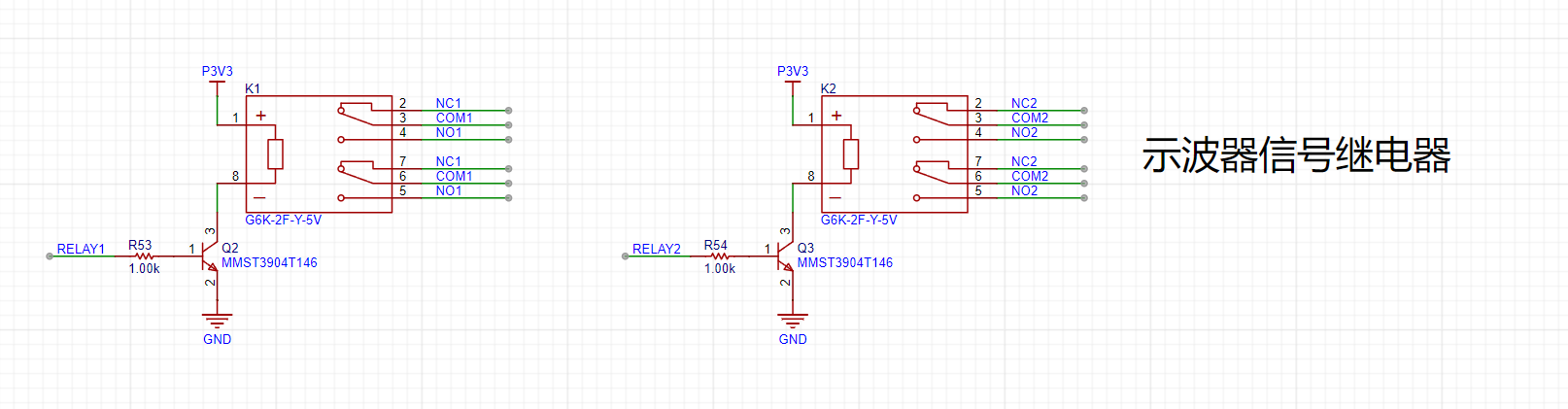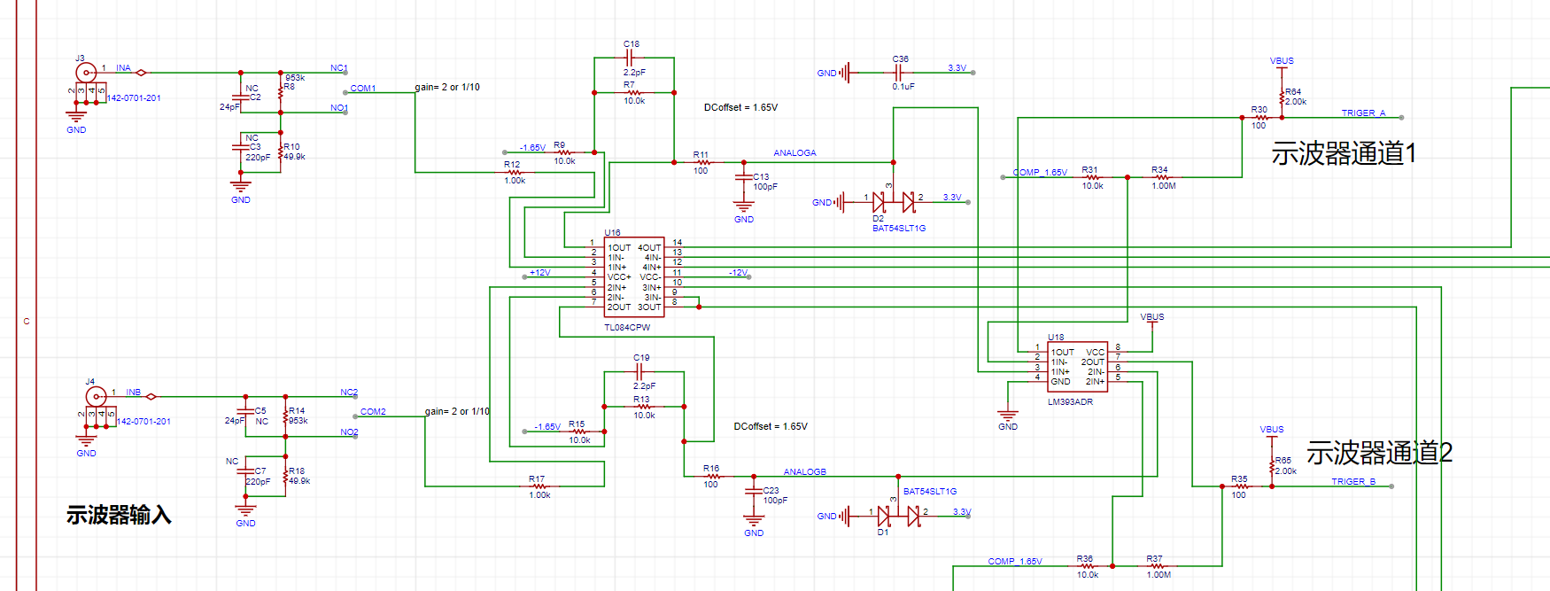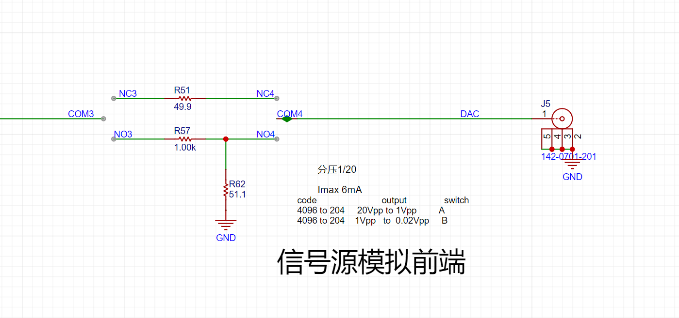 INA、INB:示波器的两个输入端,信号源发出模拟信号与此处连接,这里通过电阻串联分压实现1MΩ的输入阻抗,并产生两个信号供选择,一个输入直通,一个衰减为1/20。