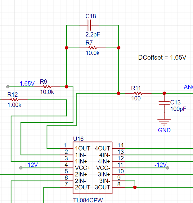 也就是说我们需要将输入信号至少衰减到0.11倍(约衰减为1/9),再加上1.65V直流,就能满足ADC的满量程输入。于是我们使用下面的运算放大器电路,电阻网络完成1/20衰减,运算放大器实现x2倍放大器和1.65V电压平移,从而实现了0.1INB+1.65V;