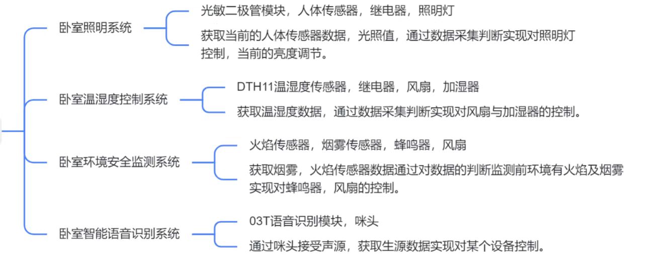 1,描述:基于梁山派的智慧卧室系统一共细分为四个子系统,如下图。