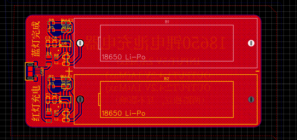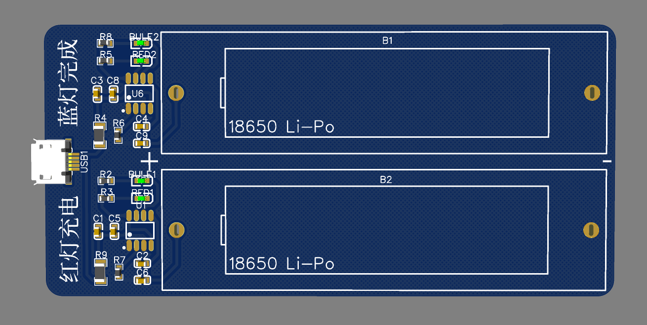1.两路18650充电电路,相互独立,每一路最大输出电流1A