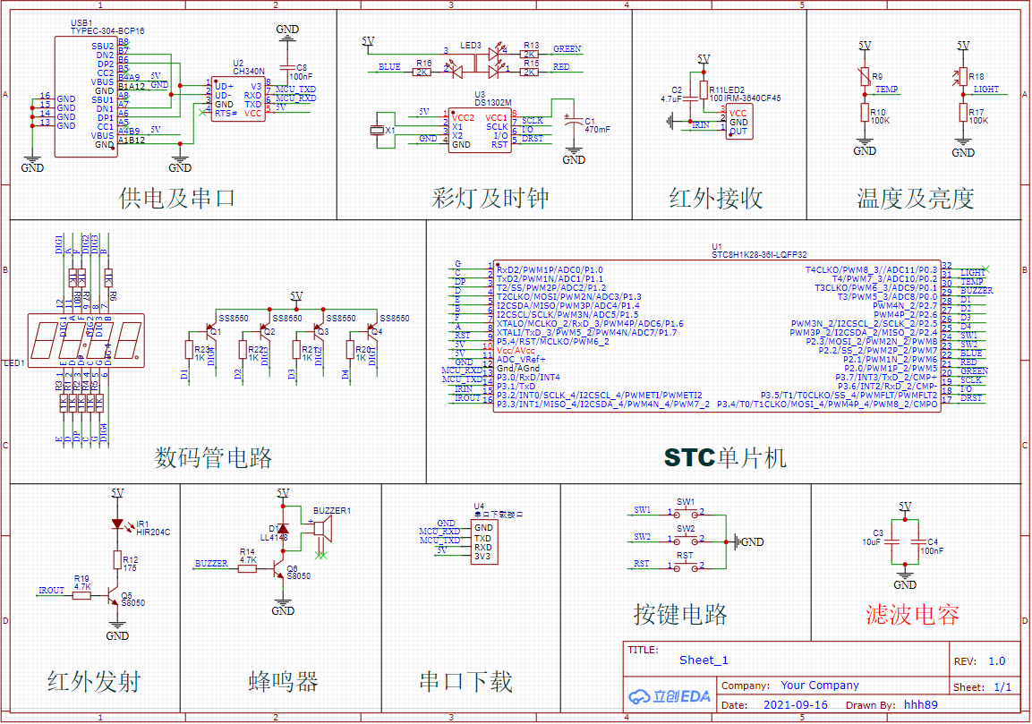 电路的原理图如图所示,如果需要改变数码管,RGB或红外发射管的最大亮度,可以适当减小相应的限流电阻大小
