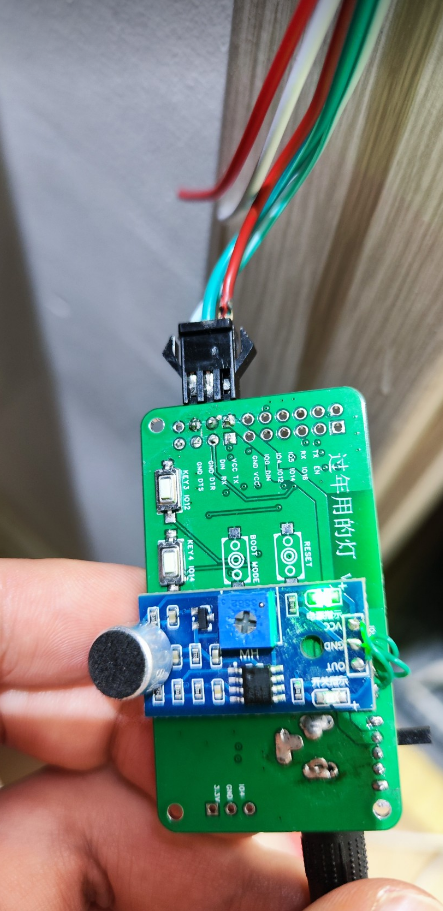 目前其中一组直接接了一个声音传感器,可以实现一喊就亮灯。由于位置和引脚顺序没规划的特别好,所以目前是飞线上去的。