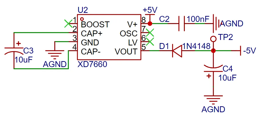 除了电源输入电路为,为保障运算放大器对于负电压的测量性能,使用了XD7660负压产生电路得到一个 负电压,该芯片外围电路简单,只需要两个电容和一个二极管即可工作,理论上输入电压为+5V,也可以输出一个-5V的电压,由于芯片内部存在一定压降及转换效率,实际测量负电压为-4.3V左右,也能满足运算放大器的要求。