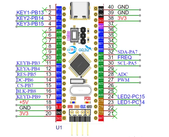 该项目使用了由立创开发板团队推出的GD32最小系统板为主控,这款开发板是由立创开发板团队联合兆易创新推出的一款全国产的开发板,板载CH340下载芯片,只需要一根数据线就可以对板子进行烧录与串口调试,同时兼容STM32最小系统板的尺寸与引脚配置,可以直接进行替换。
