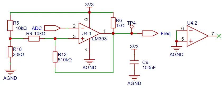 为了实现频率检测的功能,将ADC输入信号通过一个滞回比较器对输入信号进行比较,实现频率的测量功能。滞回比较器是属于电压比较器中的一种,常规的电压比较器是一个单限比较器,电路中只有一个阈值电压,但在输入电压在阈值附近有微小变化时都会引起输出电压的越变。为了增强电路的抗干扰能力,在单限比较器的基础上引入了正反馈,保障了在一定范围内信号的稳定性。通过滞回比较器电路后输出一个方波信号,使用单片机的定时器捕获功能计算出输入波形的周期大小。