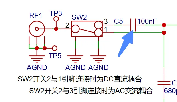 电路中通过一个拨动开关SW2对输入交直流耦合信号进行切换,当开关2与1接到一起时为直流耦合,当开关2接到3时为交流耦合。那么问题来了,这里的电容该如何取值呢?是不是任意一个电容都行?