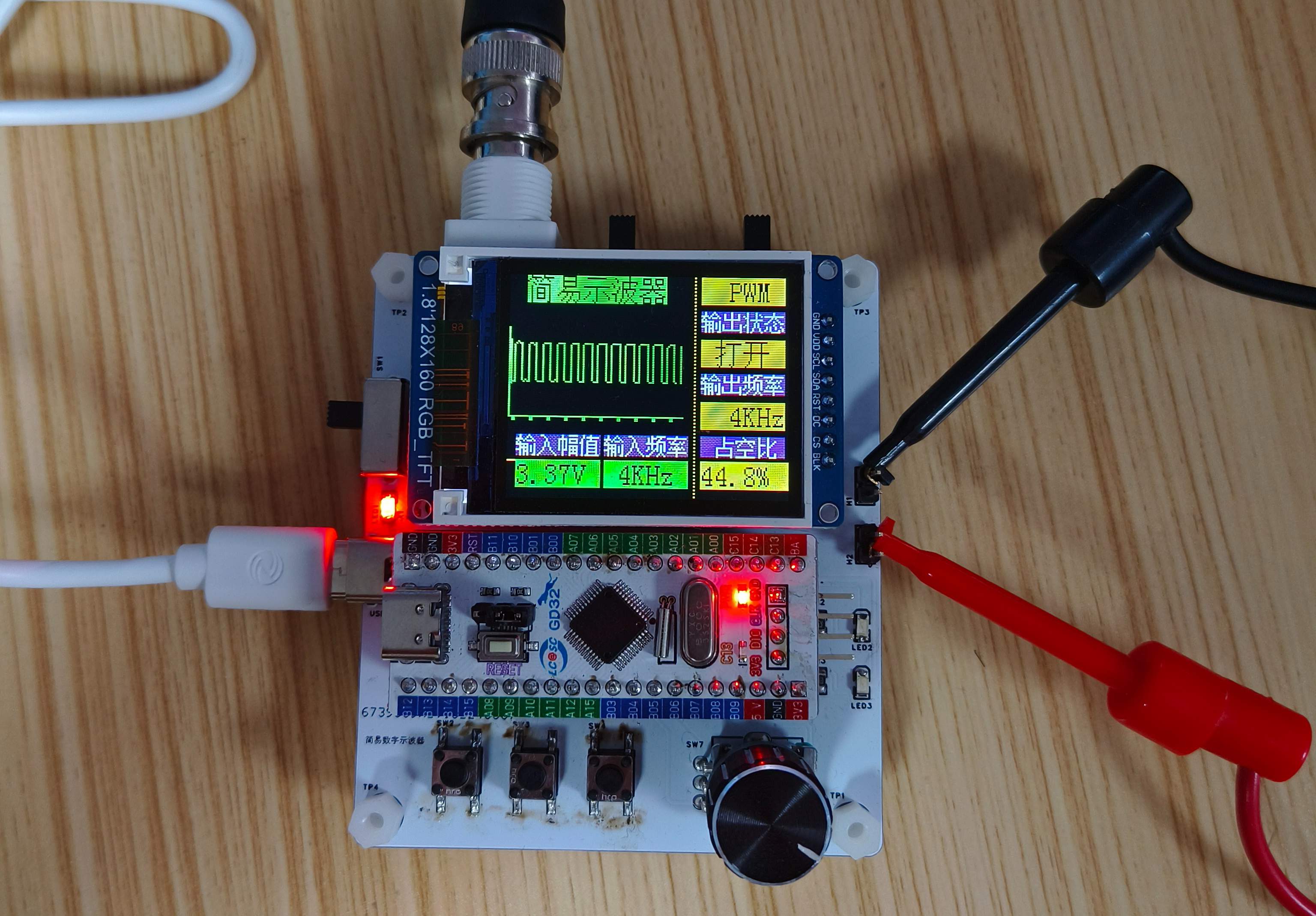 除了示波器检测功能外,单独引出了一个PWM信号用于模拟一个简易的函数发生器功能,可以通过改变输出PWM的频率和占空比输出一个简易方波信号输出。