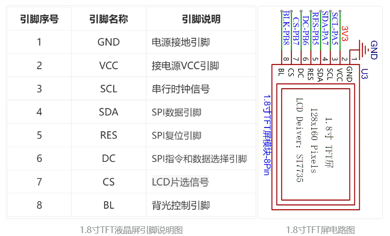 1.8 TFT 是一款彩色显示屏,具有 128 x 160 个彩色像素,使用四线SPI通信方式与单片机进行连接,一共有八根引脚,模块引脚说明及与单片机连接情况如下所示: