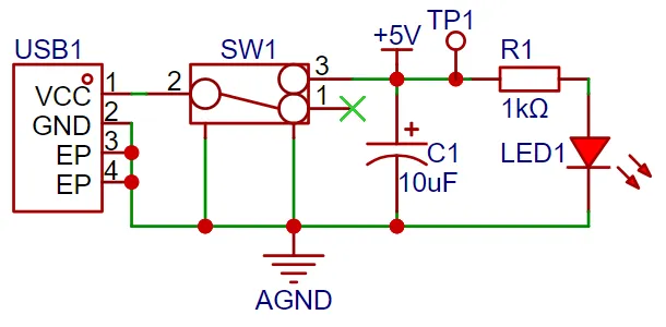 该项目使用GD32最小系统板为核心,板载了5V转3.3V降压电路,所以在设计扩展板时只需要设计一个5V电源输入电路即可,这里选用了主流的Type-C为输入接口 ,且该接口只有两根线,插件封装,方便新手焊接学习,但需要注意的是这个Type-C接口仅用于供电,不能传输数据,如果需要使用传输数据,可以使用核心板上的Type-C接口。SW1为电源总开关、C1为输入滤波电容,R1是LED1的限流电阻。