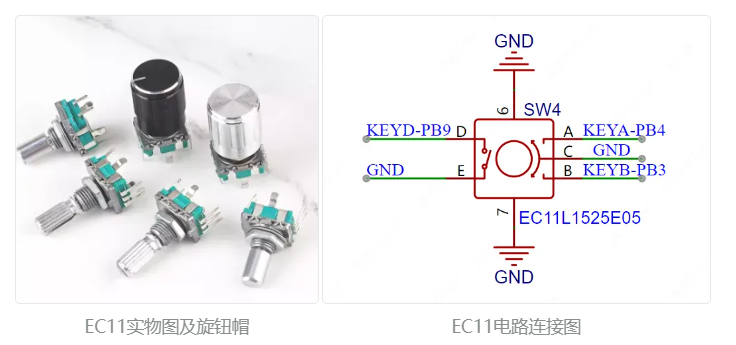 旋转编码器属于一种特殊的按键,该项目使用的EC11旋转编码器有五个引脚,其中DE两个引脚类似于普通按键引脚,按下导通,松手断开,其余ABC三个引脚用于检测旋钮的转动方向,C脚为公共端,直接接地就行。