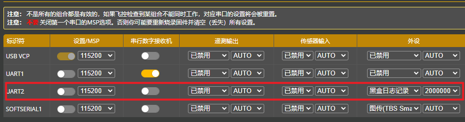 (1)将空闲硬件串口分配给“黑盒日志记录”给定波特率2M“2000000”