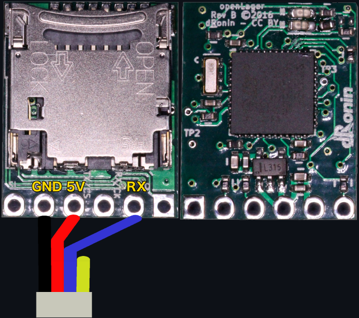 OpenLager 易于与UART串口一起使用。首先,根据下图进行接线(图中是 OpenPilot 式连接器的示例)。请注意,您应该将飞控连接到 openlager 的引脚上!TX->RX