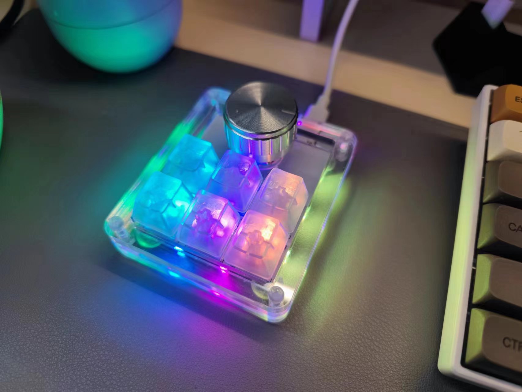 简介:一款使用CH582M的旋钮小键盘,包含了6个按键和一个旋钮,可以通过上位机在线修改按键和旋钮的值;键盘还支持20个宏,以及自定义的16种灯效。开源协议