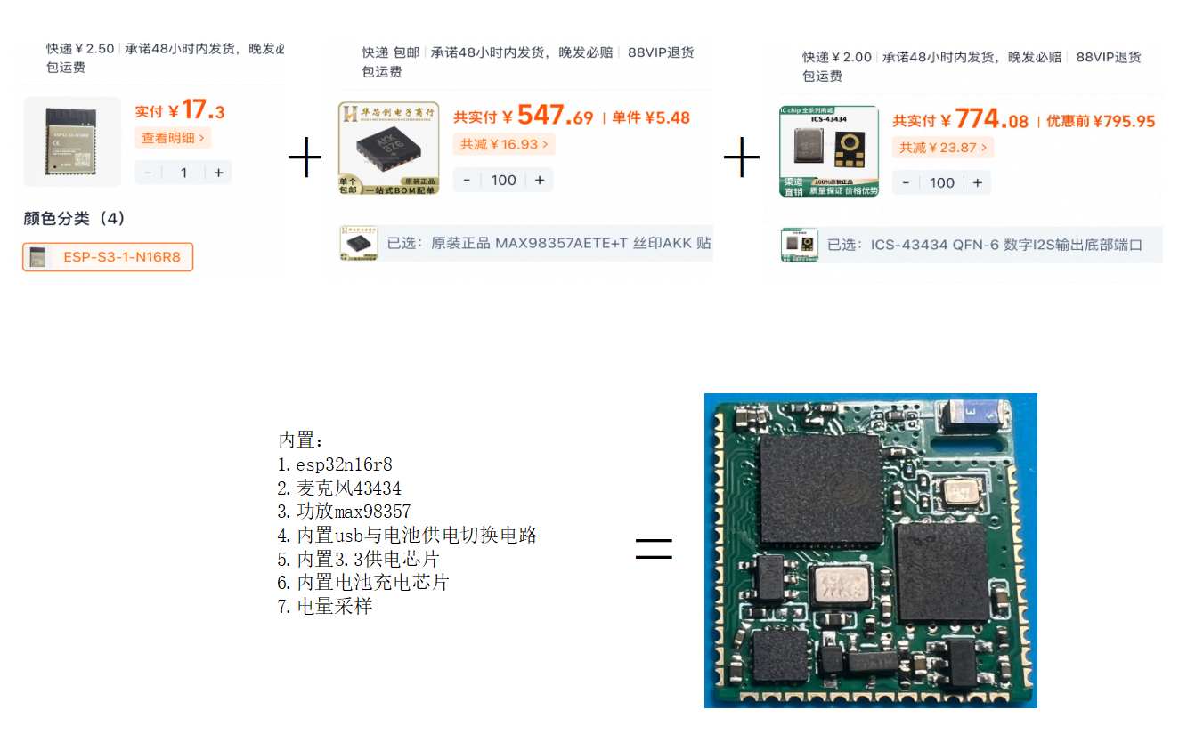 K08小智模块版底板-AI小智DIY烙铁版 自封装ESP32s3+max98357+ics43434模块。模块可单独使用,仅需接喇叭和供电4跟线即可正常使用。底板用来扩展适配各种形态和屏幕。