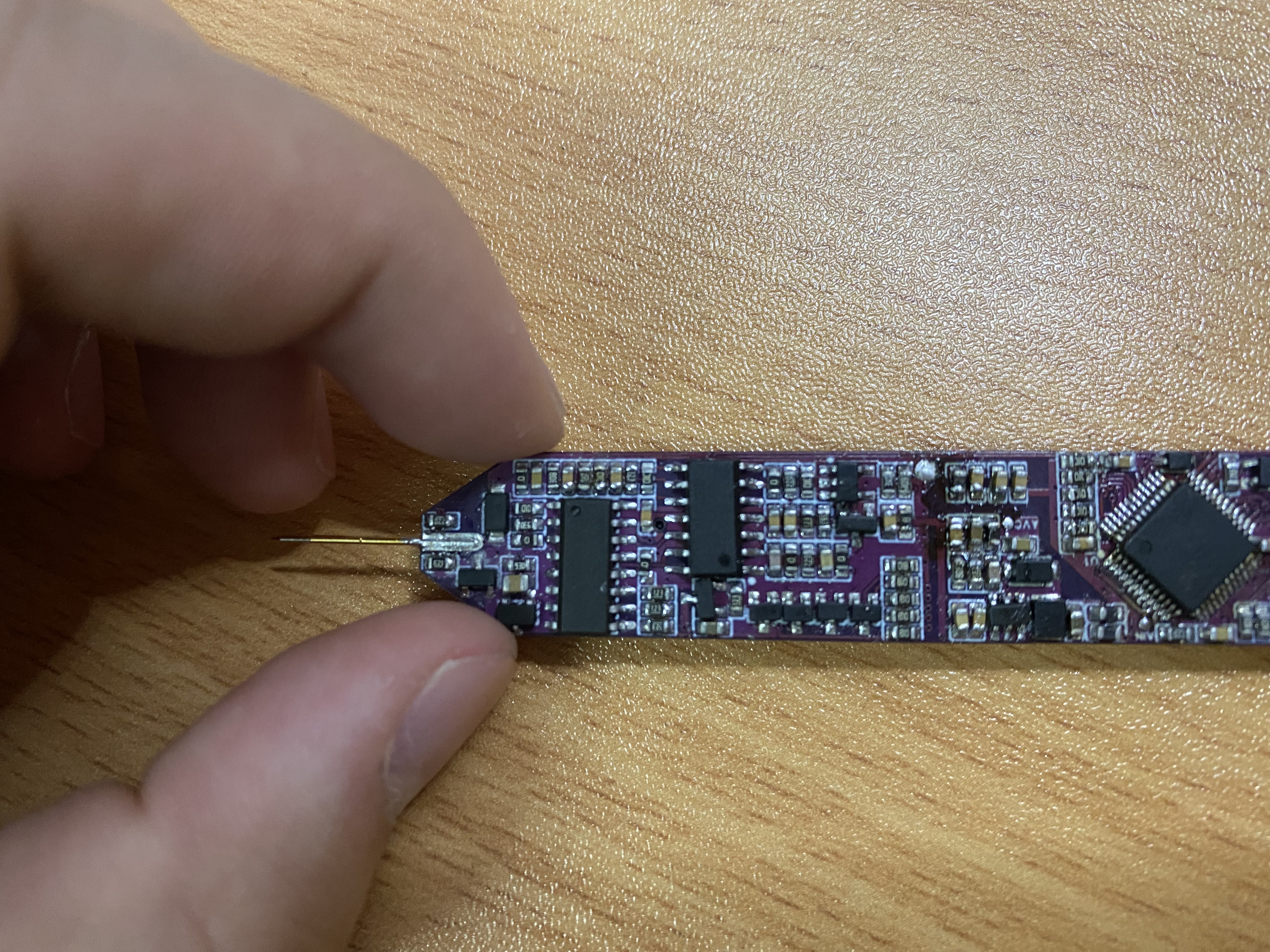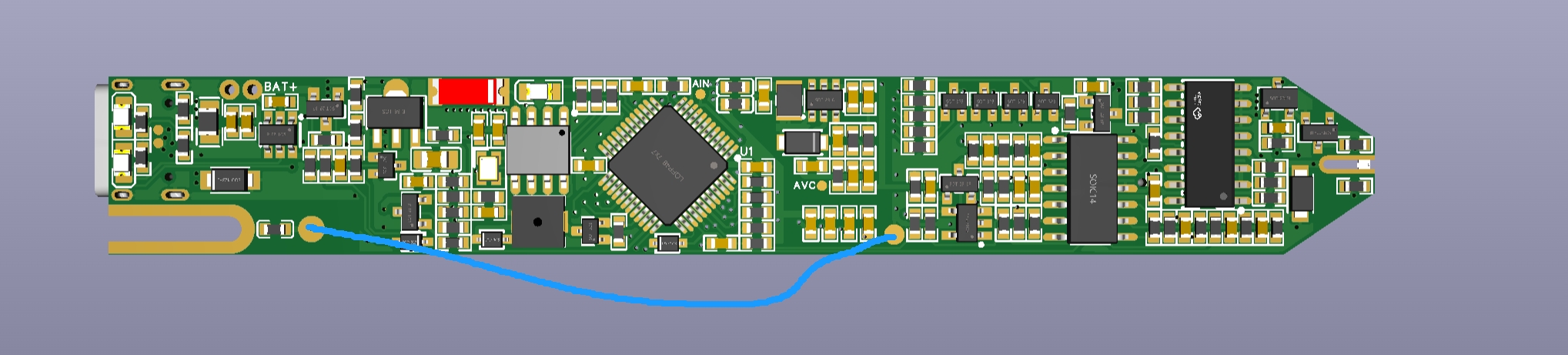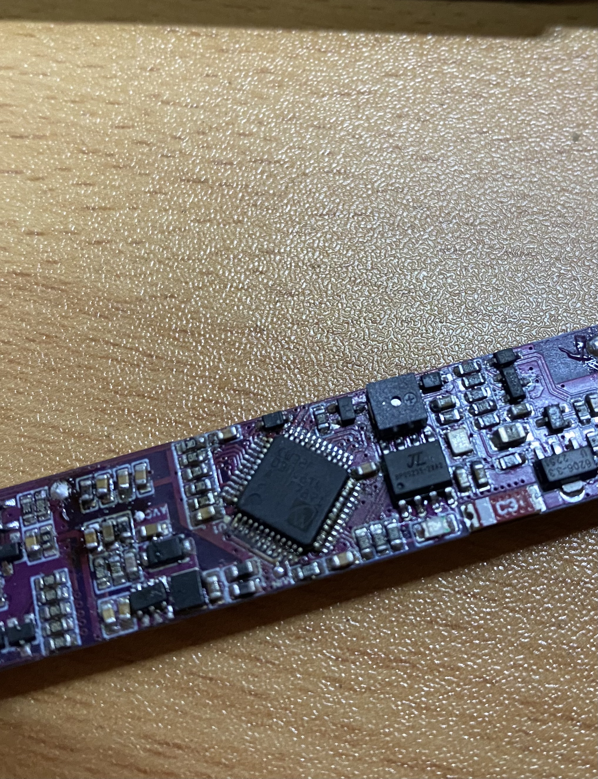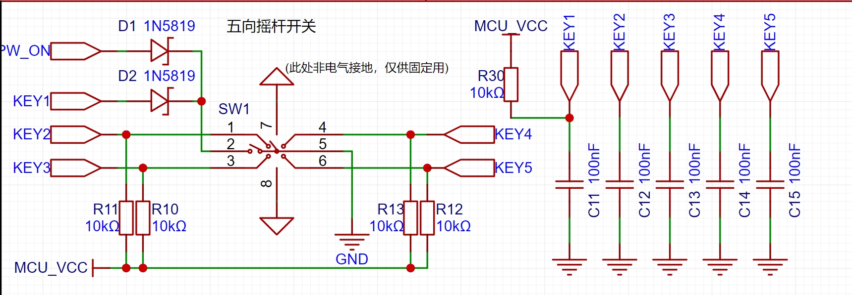 在上图中,左侧是电源控制部分,中键是电量采集部分,右侧是五向摇杆开关,其中的中键是开机按键。