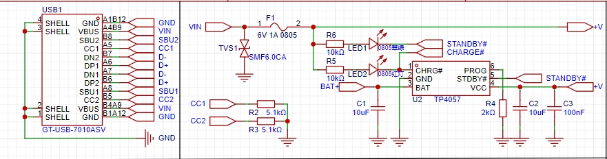 在充电ic部分我选择了常用的TP4057作为主控,电源输入采用了最常见的Type-C接口。