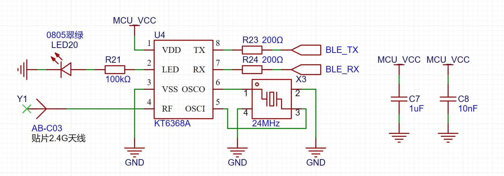 在芯片选型时,我选择了KT6368A这颗BLE、SPP双模芯片,基于杰理AC6368A,这颗芯片支持蓝牙5.1,当然更重要的是,这颗芯片使用晶振时不需要起振电容,其他的外围电路也极其简单,有助于在拥挤的PCB上节约宝贵的面积。
