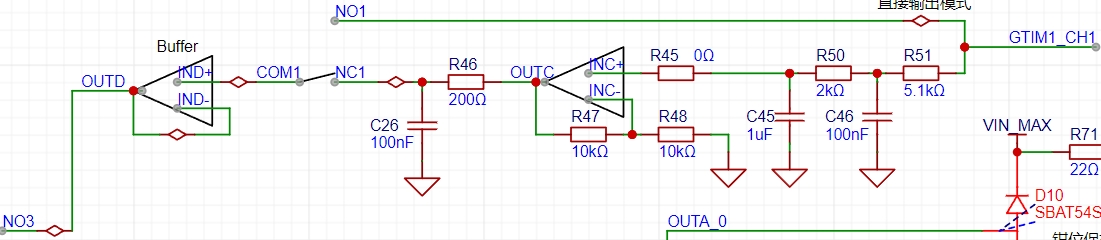 信号输出电路可以用于输出直流信号或直接输出PWM信号,其中直接输出没什么好说的,就是直接输出单片机的信号,而输出直流电平则是通过PWM调整占空比,然后经过两级的低通滤波转换出的“直流”信号。