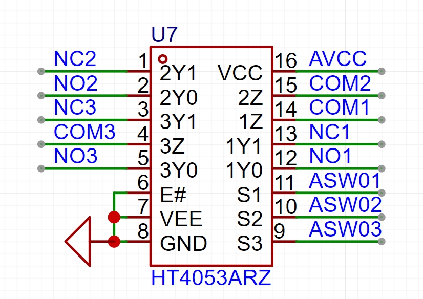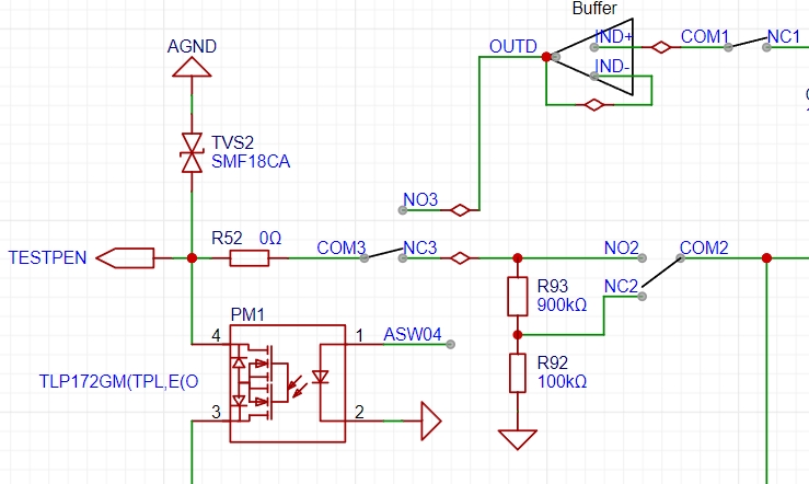 上图就是最基本的信号输入电路了,首先会有一颗双向TVS对后级电路进行保护,随后,信号通过模拟开关3(即COM3与NC3、NO3)可以选择是工作在信号输入还是输出状态(默认输出模式),通过模拟开关2可以选择输入信号是否进行衰减,模拟前端的设计参考了示波器的设计,输入内阻为1M,可以和示波器一样选择X1和X10的档位,默认选择X10档位,这样的设计最大程度上保证了后级电路的安全,就像在有独立开关机按键的万用表上,我们在收纳万用表时,应当把档位调整为“交流电压、最大量程”一样的道理。