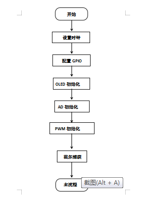 本次设计软件部分,设计的核心是直流电机6步有感换相操作但是涉及多种软件功能如:PWM、捕获、AD等,具体软件流程图如下: