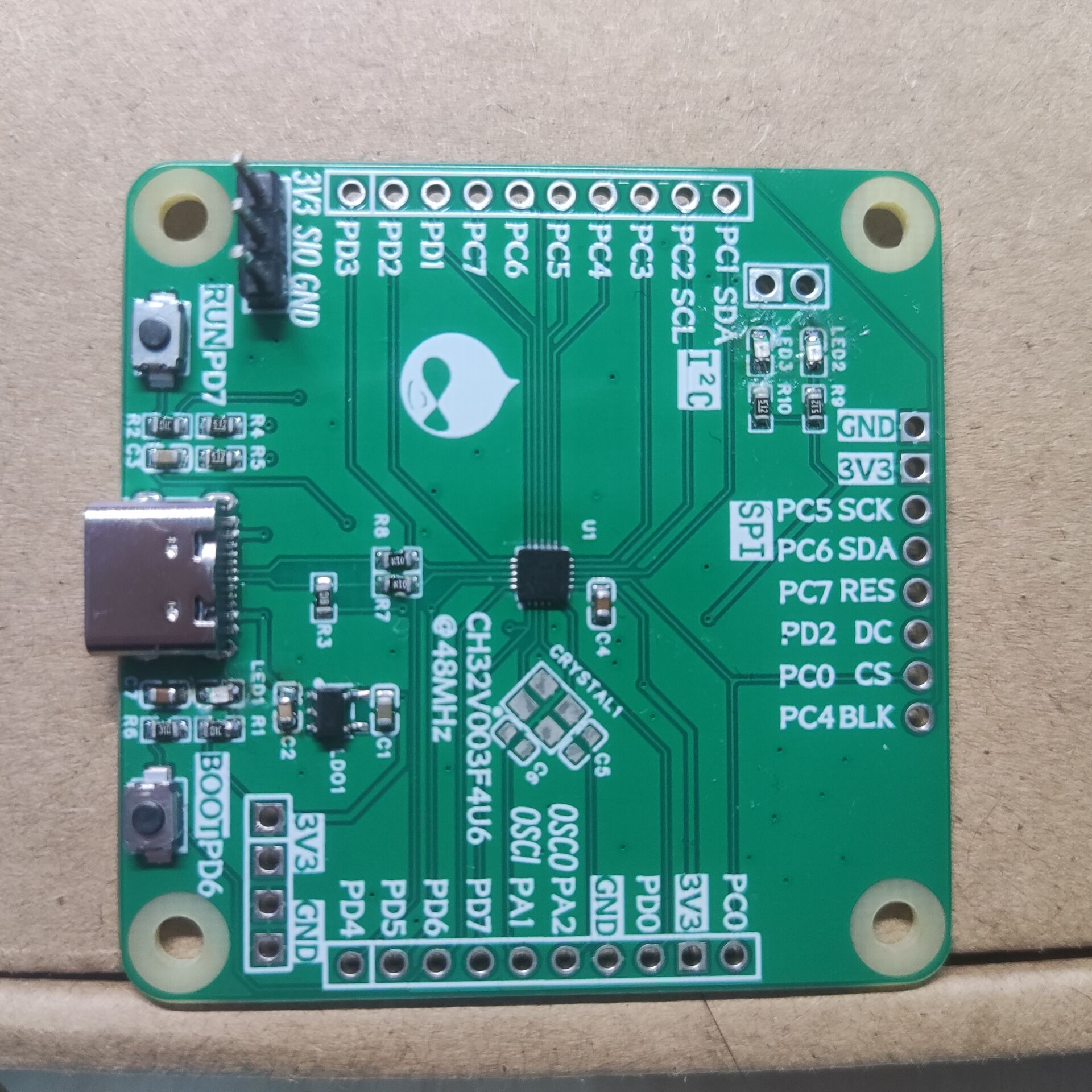 Type C 接口,LDO 3.3V 供电,全部引脚引出,引出ch32v003的单线debug接口。