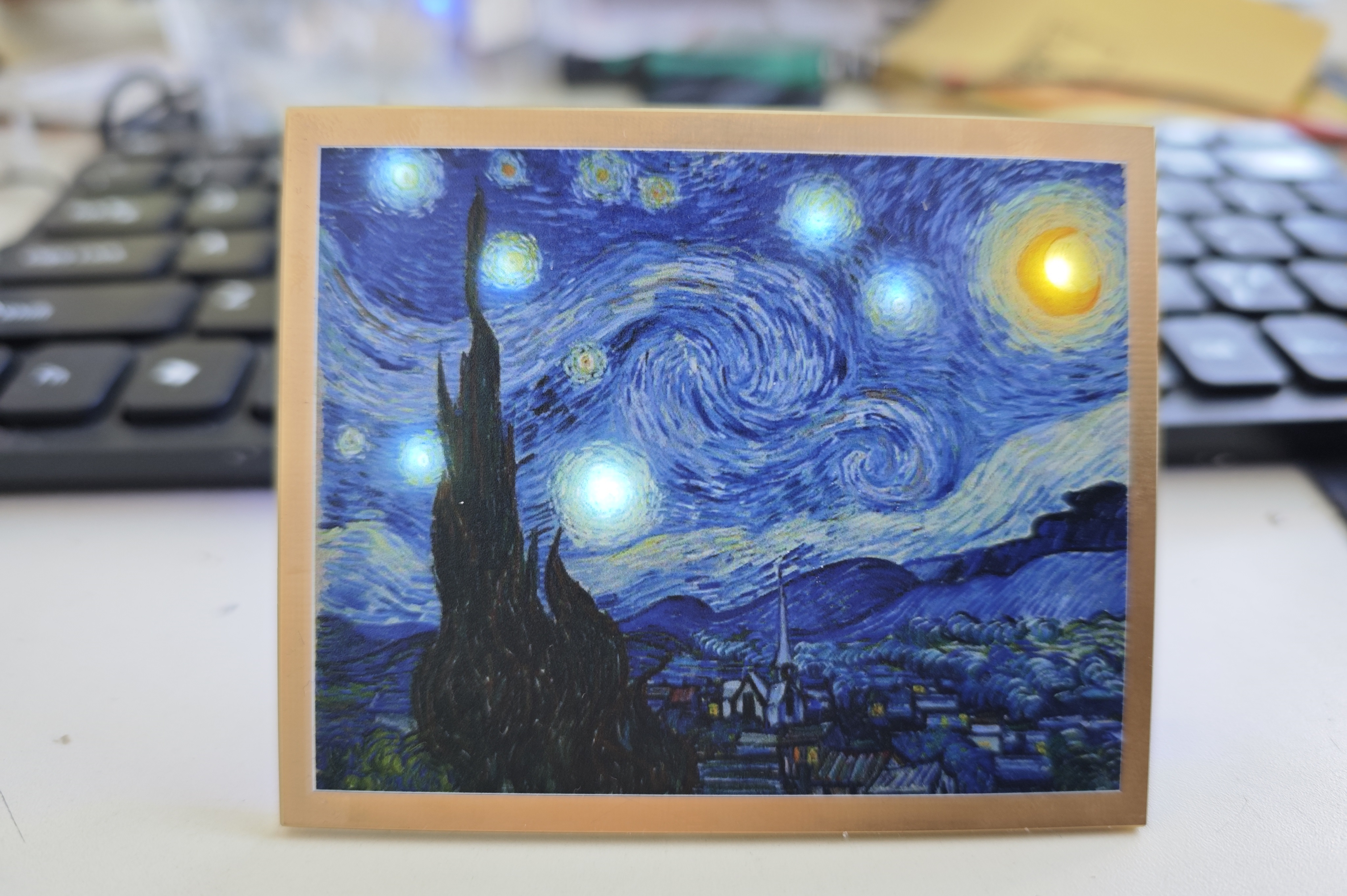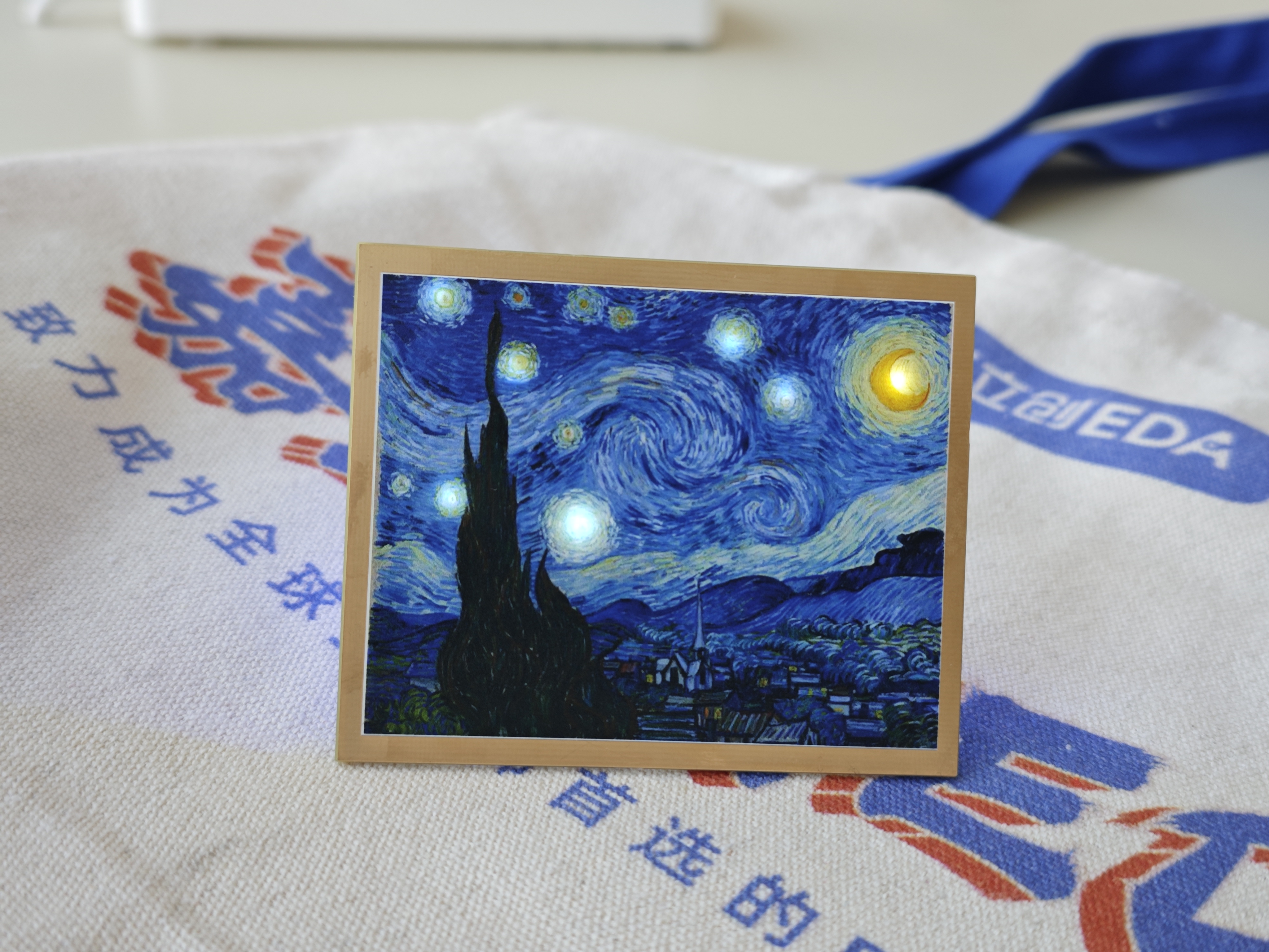 采用嘉立创彩色丝印,在梵高的星空后面添加了电池和LED,是一个不错的桌面摆件