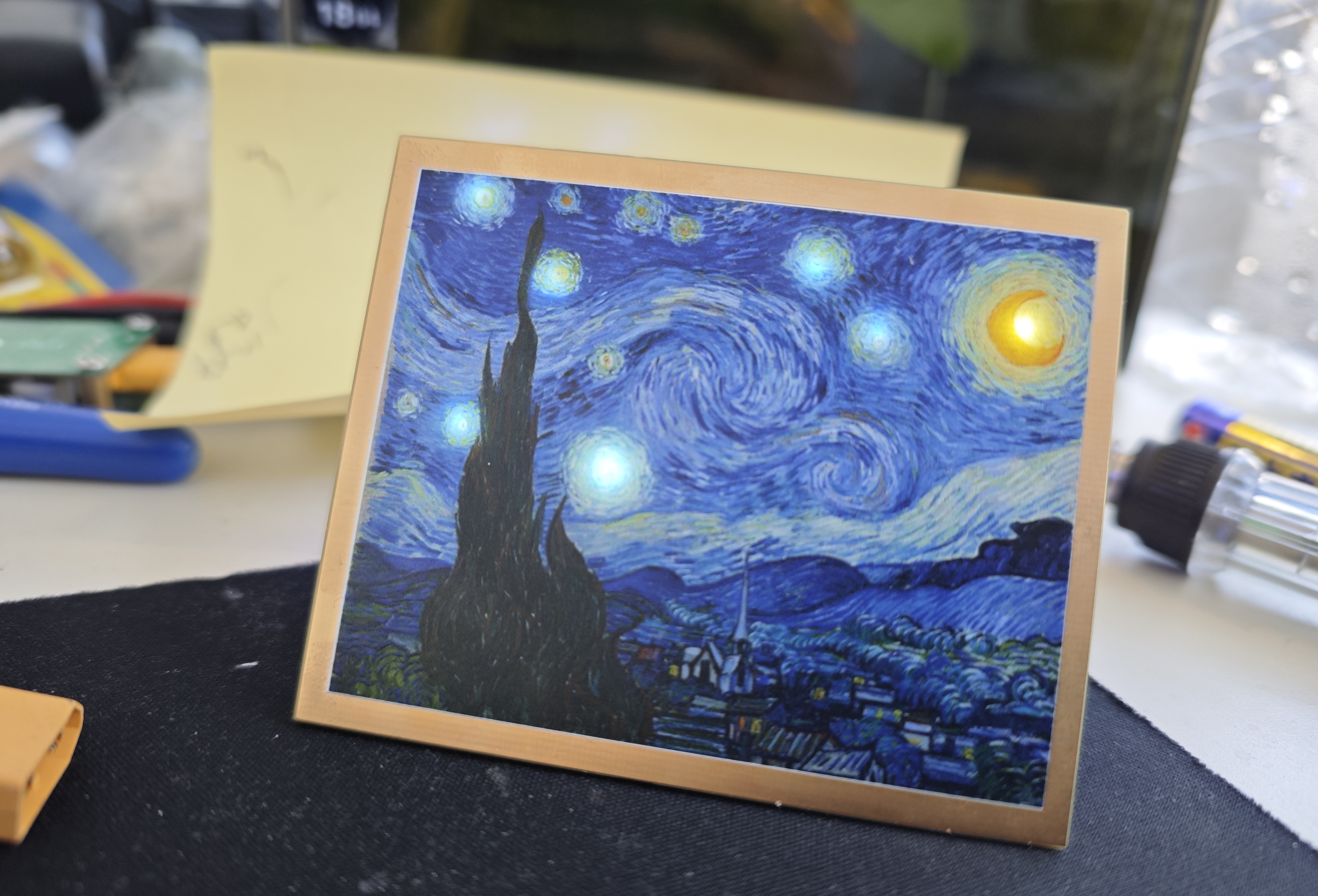 这不仅是一次简单的改造,更是对梵高作品的一次人性化演绎。LED的柔和光辉不仅为画作增色添彩,更让观者仿佛穿越时空,亲身感受到梵高在创作时的情感与灵感。这个充满温度的星空,不再只是画布上的静态之美,而是与我们共鸣的、有生命的存在。