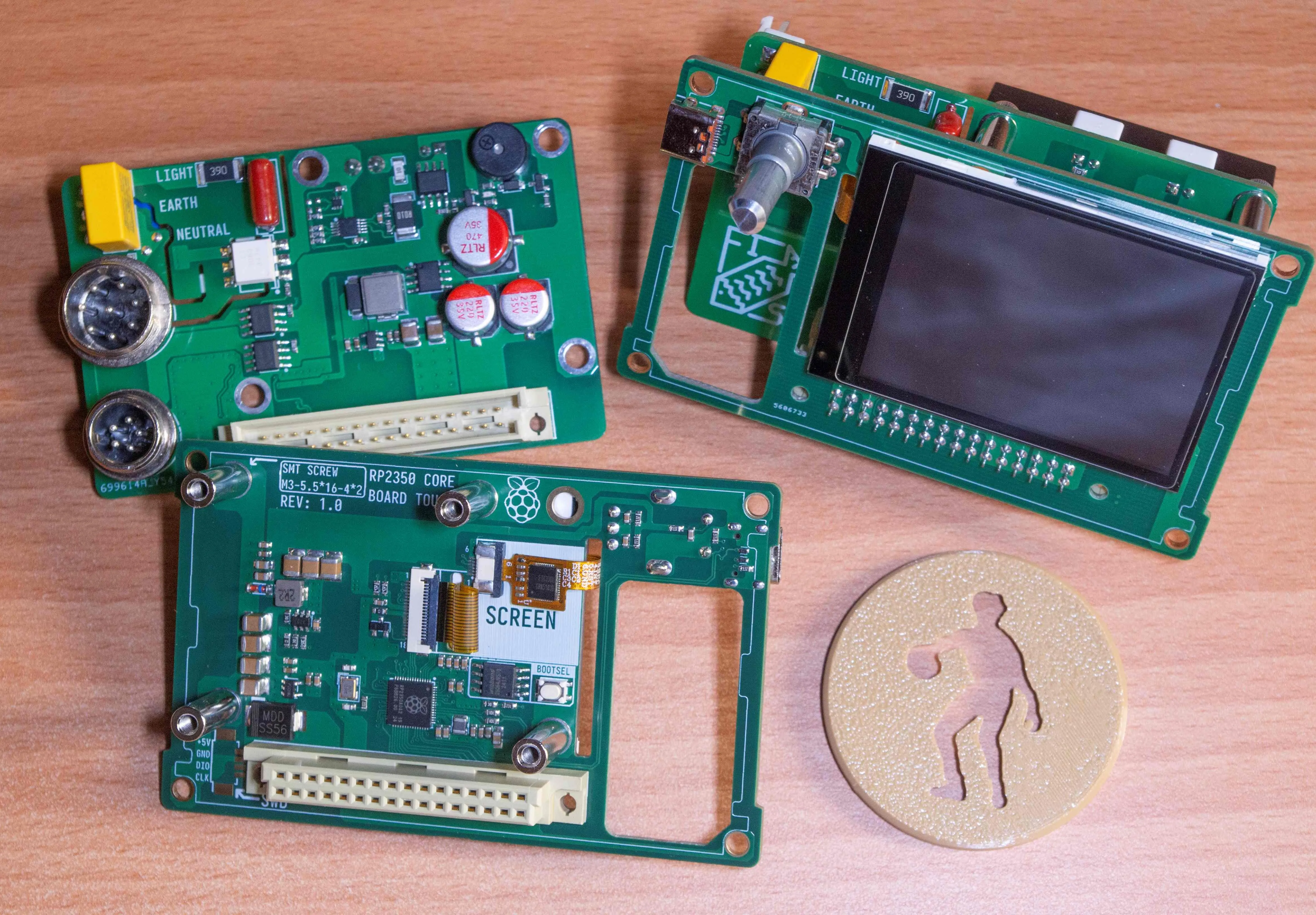 RP2350A&RP2040开发板,集成2.4寸电容触摸屏和旋转编码器,通过板对板连接器引出GPIO以连接扩展板,辅以SMT焊接螺柱固定扩展板。