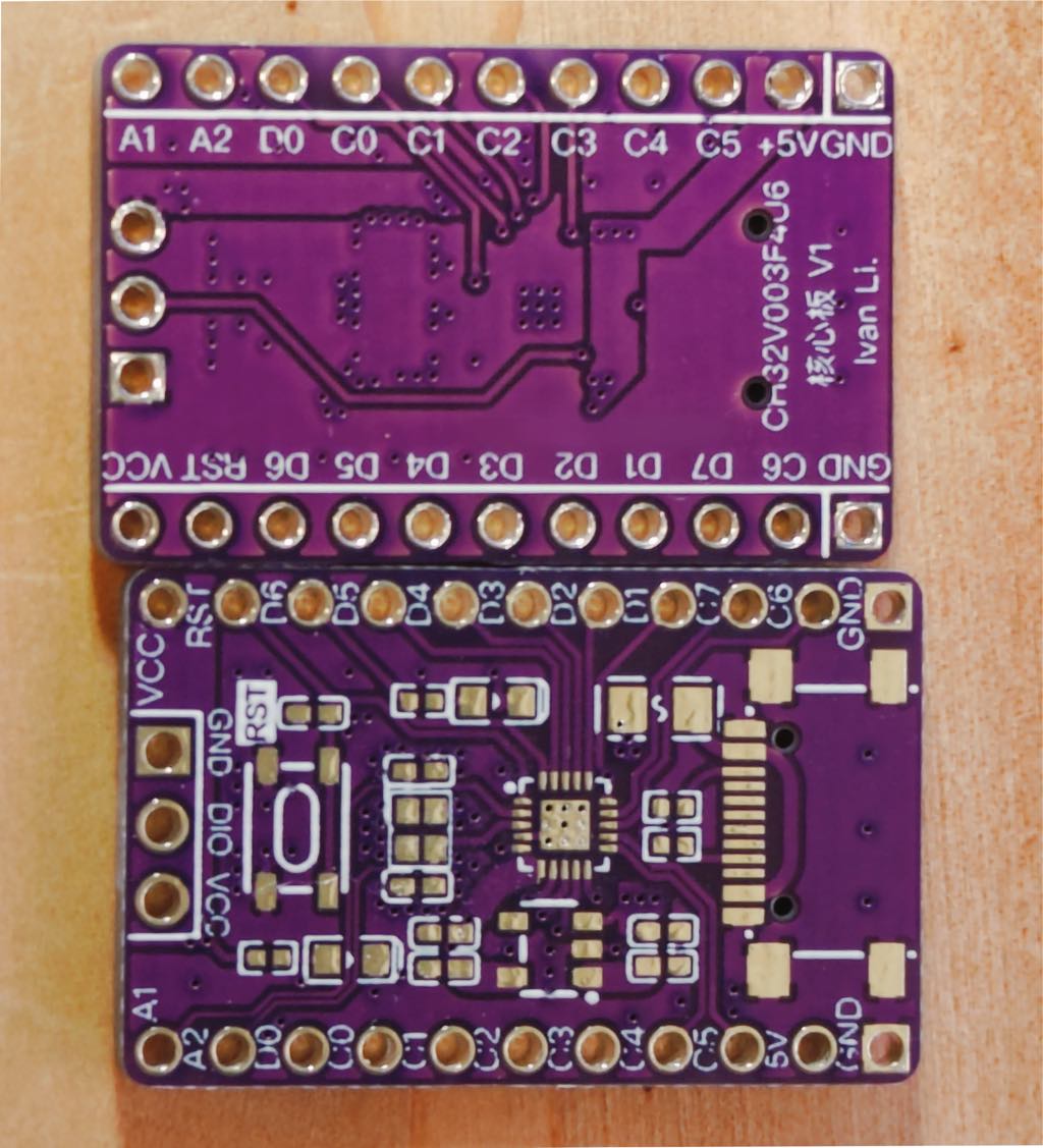 使用 CH32V003F4U6,QFN-20(3X3) 封装,有完整的 CH32V003 功能。板载 24MHz 无源晶振。已验证功能正常。