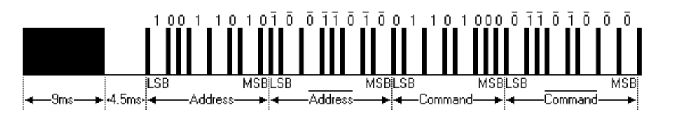 每一帧的起始标志序列为:9ms的AGC脉冲(是逻辑数据位使用的脉冲560us的16倍)+4.5毫秒的空闲。