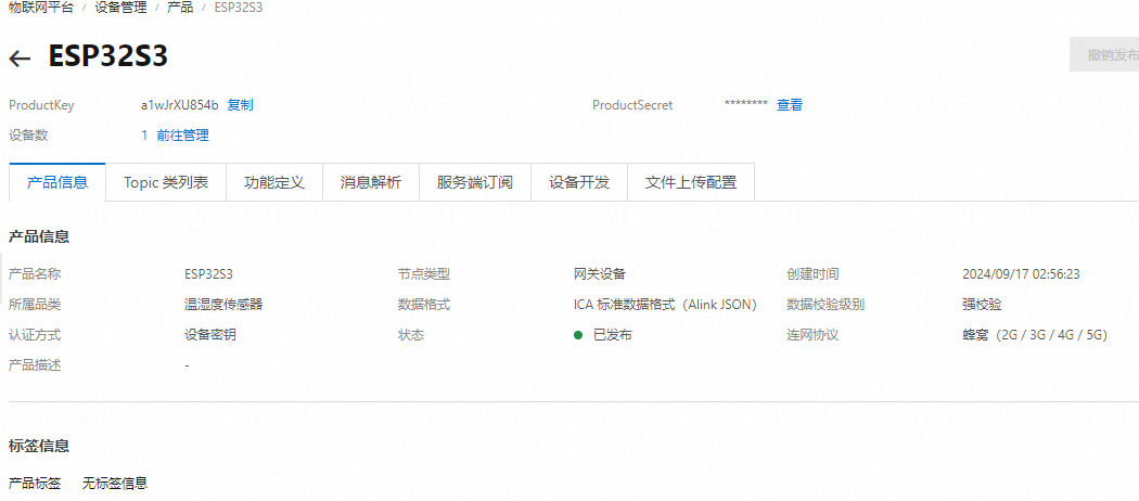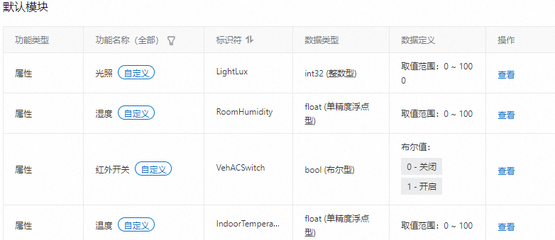 工程采用了MQTT协议与阿里云进行连接,在编写程序前,需前往阿里云物联网平台注册账号并创建产品和设备,并定义产品功能:
