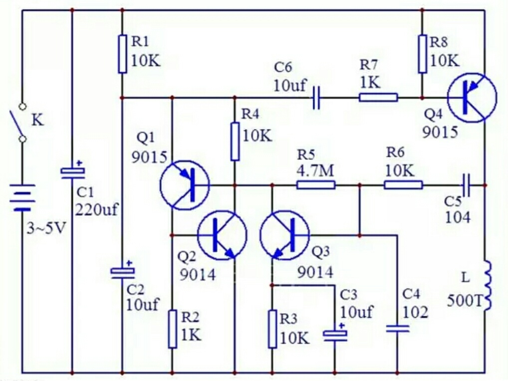 首先当磁铁经过线圈,线圈会感应出一个电流,这个电流是交变的,可以通过电容,所以会经过C4、C5、R6构成回路。当正半周时Q3基极被感应电压拉高,Q3被导通,使Q1基极被拉低,Q1导通,而Q1导通会把Q2基极拉高,Q2导通,Q2导通又会把Q1基极拉低,形成正反馈,Q1Q2被完全导通。此时就同时发生了两件事,第一是Q1发射极被拉低,C6通过R7R8和Q4发射结冲电,电容有个特性,充电的一瞬间可以看作短路,所以Q4基极会被拉低一瞬间,随后又被R8拉高截至,在被拉低的一瞬间Q4会导通,线圈得电,摆获得推力;第二是C2通过Q1被R2放电,C2电压跌至不足以维持Q1Q2Q3导通,Q1Q2Q3全部截至,然后C2通过R1被充电,电路进入下一个循环。