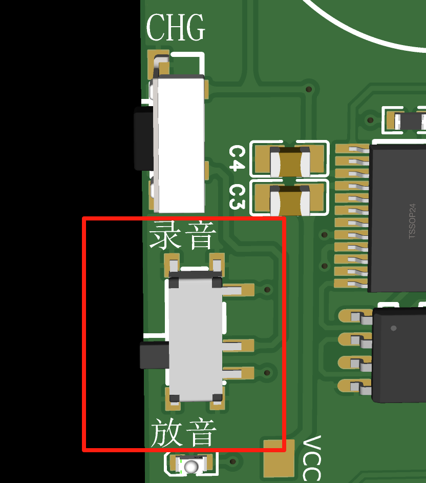 主控芯片采用CHR05,操作极其简单,只有两个按键,一个录音一个播放,录放模式都可以通过拨码开关更改。
