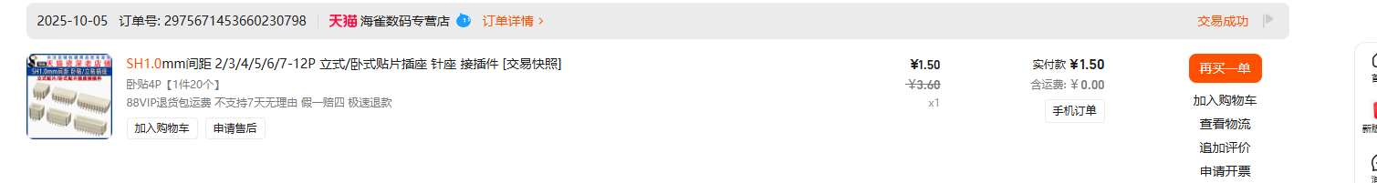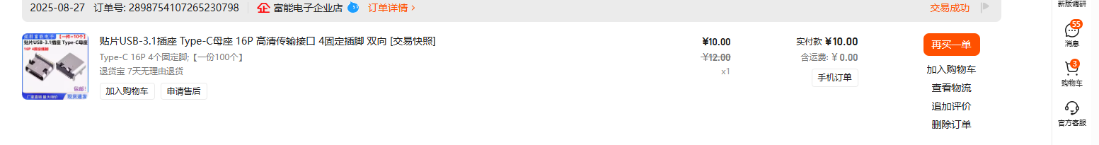 物料如下:SH1.0 4P双头同向 长度推荐100mm 视频有说明为什么 SH1.0 4P卧贴座子 TYPEC 16P 4脚 以及0603 5.1K电阻精度随便 如需贴0805 0402 0201自行修改PCB文件打板