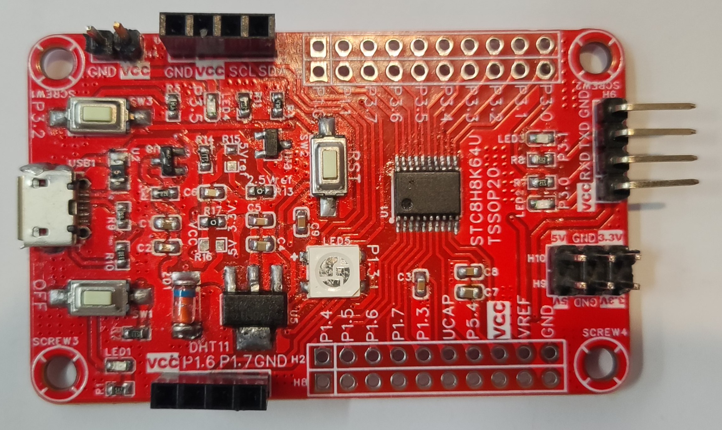 基于STC8H8K64U-TSSOP20的可扩展温湿度计设计,芯片排针全部引出,便于进一步开发。提供DHT11温湿度传感器的串口测试代码,IIC通信协议的4脚OLED显示屏接口可用于工程温湿度显示和调试。