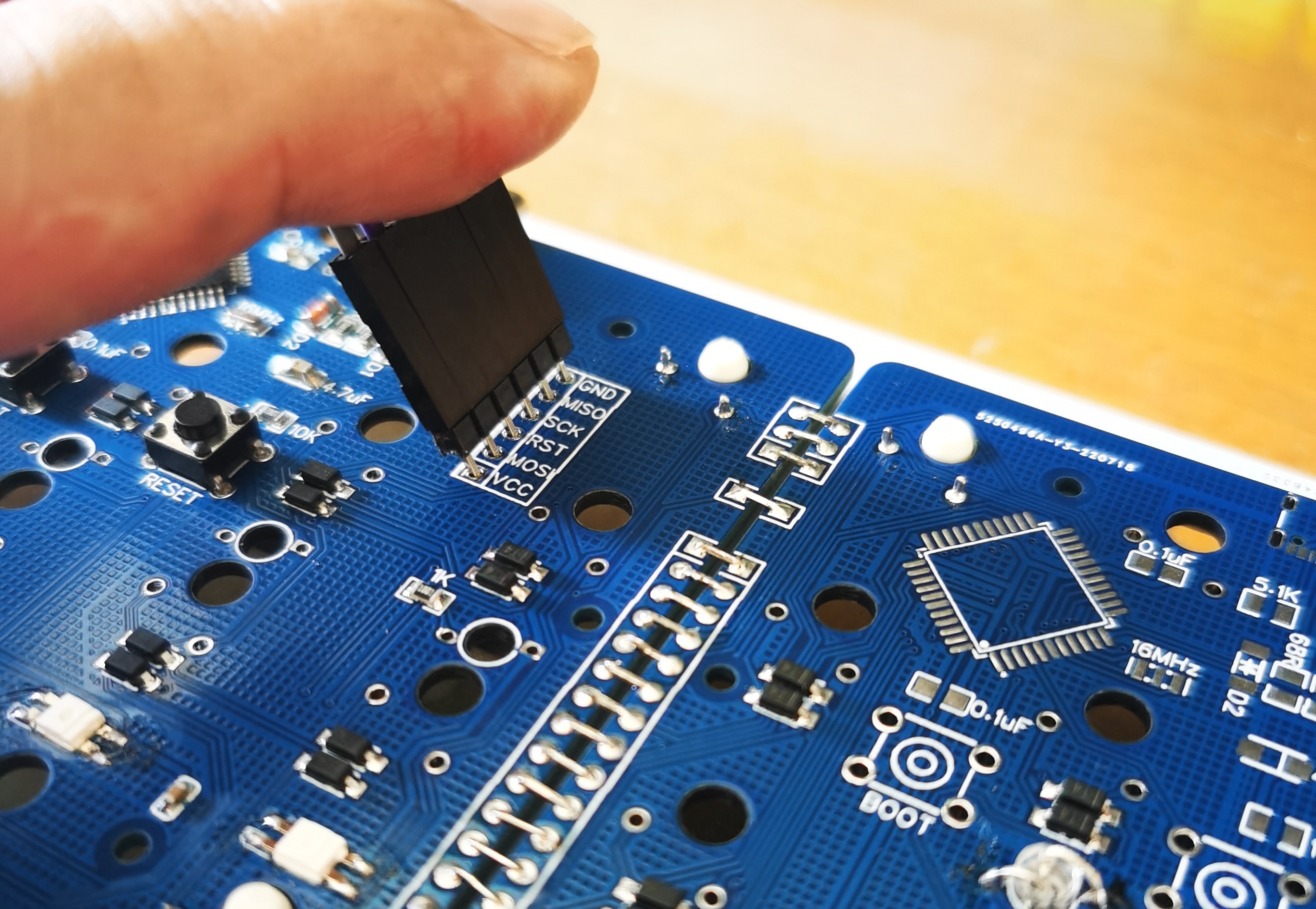 烧录bootloader时如有烧录针最好,没有的话在杜邦线插上普通插针,然后斜插到PCB插孔上,烧录时轻轻按压即可,反正只需烧录一次。